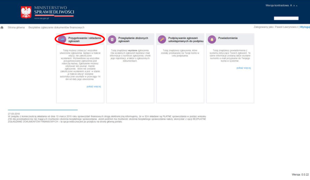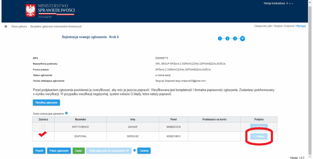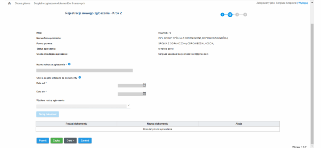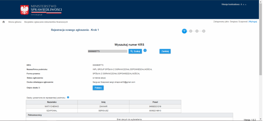 — Как только Ваша компания будет найдена, в окне появится ее страница в KRS и имена лиц, имеющих право подписывать отчеты, а также список ранее поданных документов.