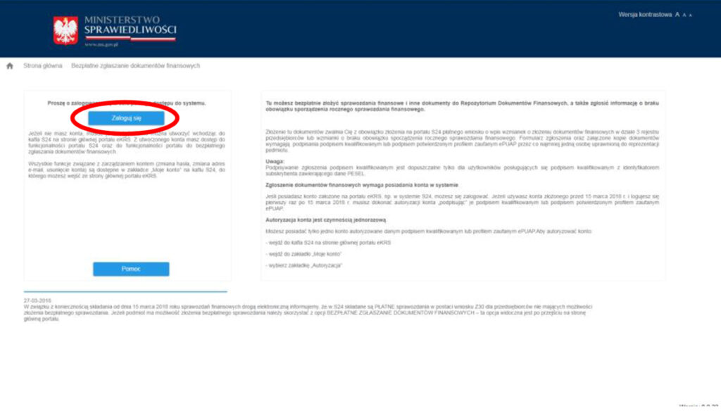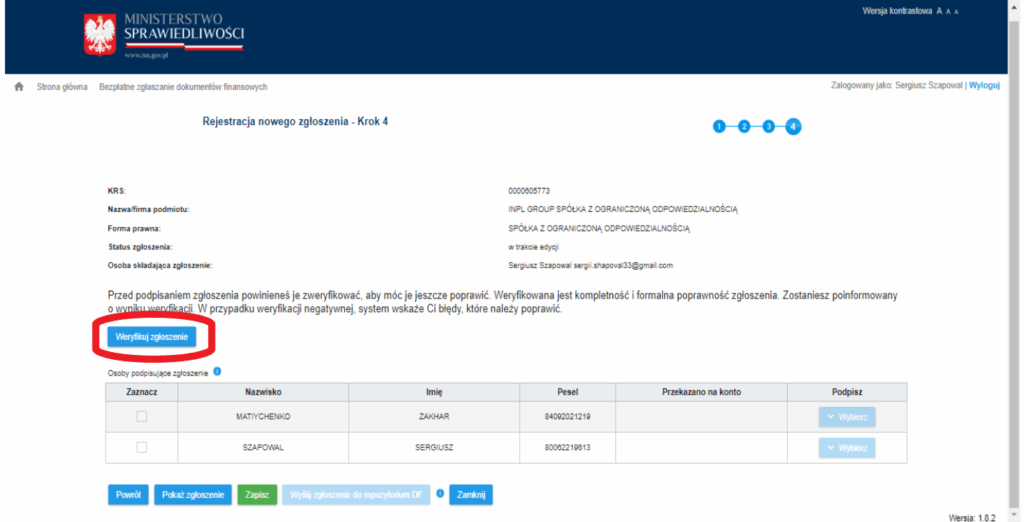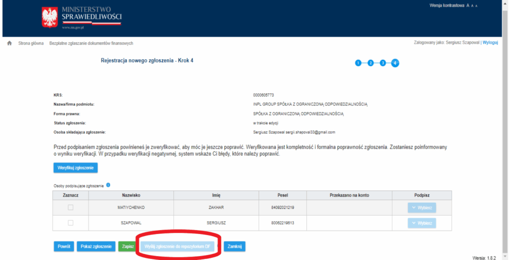 После того, как отчет подписан, его необходимо отправить в KRS, чтобы включить в центральную базу данных польских компаний. Затем информация поступает в налоговую инспекцию и появляется в заявлении о восстановлении — проверив его, Вы убедитесь, что отчет был правильно подан и принят.